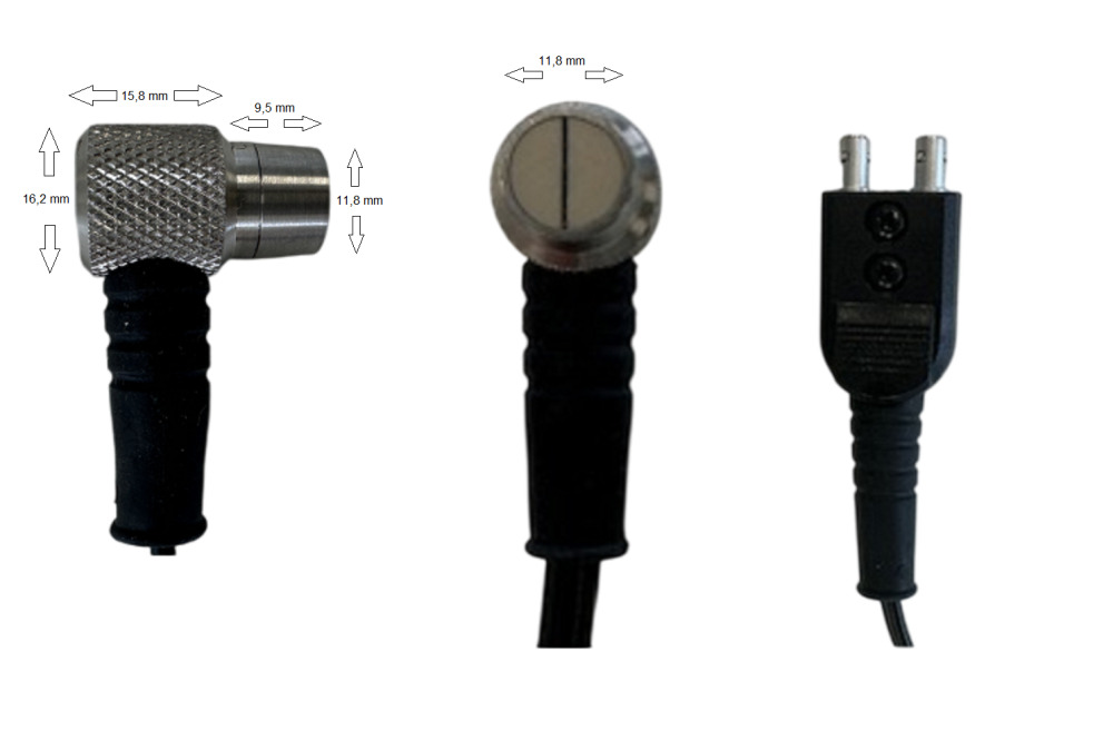 Estas dimensiones compactas son ideales para aplicaciones que requieren acceso a superficies restringidas o curvas, garantizando un acoplamiento óptimo y estabilidad en la medición con la mayoría de medidores de espesor ultrasónicos.
