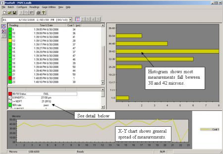 | Cálculo instantáneo de promedio, desviación estándar, grosor mínimo/máximo y número de lecturas durante la medición |