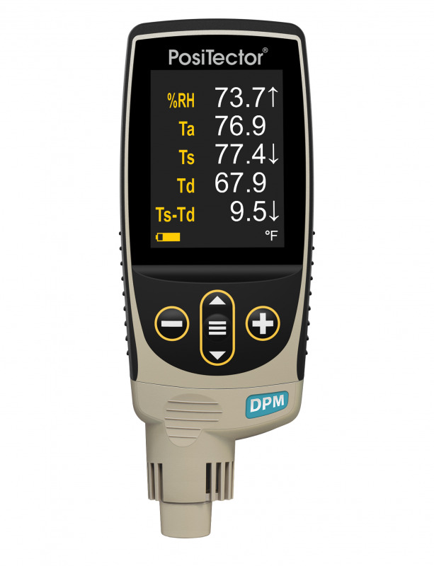 El PositecTor DPM mide parámetros climáticos como la temperatura del aire, la temperatura de la superficie, la temperatura del punto de rocío y la diferencia entre las temperaturas de la superficie y del punto de rocío, que es fundamental para determinar la probabilidad de condensación. Este medidor es ideal para la preparación de superficies, tal como exige la norma ISO 8502-4.