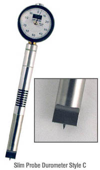 Se utiliza para comprobar áreas de difícil acceso. Este modelo de sensor fino también está disponible en el durómetro tipo M con un soporte de 1/8" de diámetro, ideal para comprobar áreas finas (tan finas como 0,050") de difícil acceso.