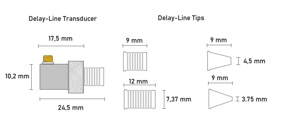 El transductor de retardo está diseñado con una carcasa compacta que mide 24,5 mm de longitud total, 17,5 mm de profundidad del cuerpo y 10,2 mm de altura. Está equipado con un conector microdot que garantiza una conexión segura y un rendimiento fiable en aplicaciones ultrasónicas de precisión.